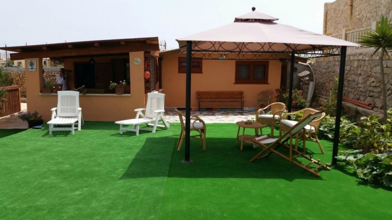 1 giardino con gazebo e lettini